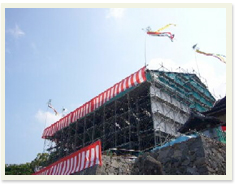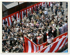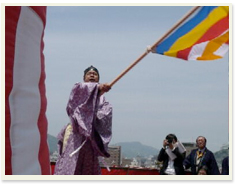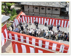 曳綱の儀 検知役の合図で、棟梁が仏旗をふり、棟上が開始されます。 |
