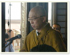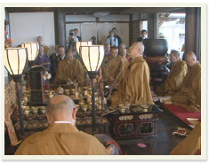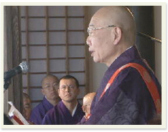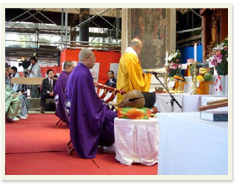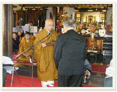 法要 住職が読経をして本堂工事の安全を祈ります。 当日は当山所有の掛け軸不動明王三童子像(国指定重要文化財)も公開しました。