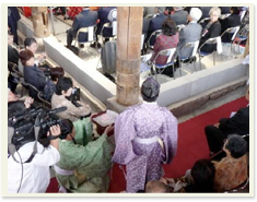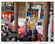 四方の柱にお餅とお金をまき、本堂の安全を祈ります。 |