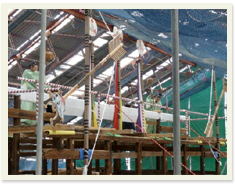 みんなで綱を曳いて、棟木を柱の上に上げます。 |