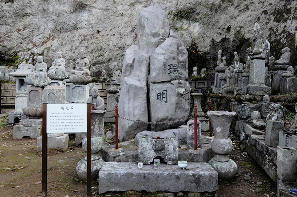寺院建立の達成を千手観音に祈願していた慶順僧都が、東の方角に白く輝く雲のようなものが立ち昇るのを発見。不思議な場所で光を発していた大石が、現在も本堂の裏手に残されています。慶順僧都により瑞光石と名付けられ、清水寺を開いた後も光を放っていましたが、第四代瑞桂が「瑞光明」の文字を刻んだ後、光らなくなったと伝えられています。高さ約2.5メートルの安山岩です。